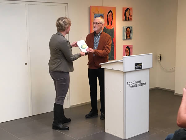Kunstenares Marij van Aken hield een korte inleiding op mijn werk en langdurige vriendschap, waarna ik het eerste exemplaar uitreikte aan mevrouw Claudia Bisschops, wethouder van o.a. kunst en cultuur in Valkenburg.